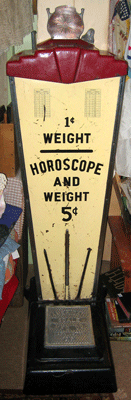 | Antique, working scale - come give it a try! For 5 cents it will tell you your weight and your horoscope, or, for $300, you can take it home. | ![]() |